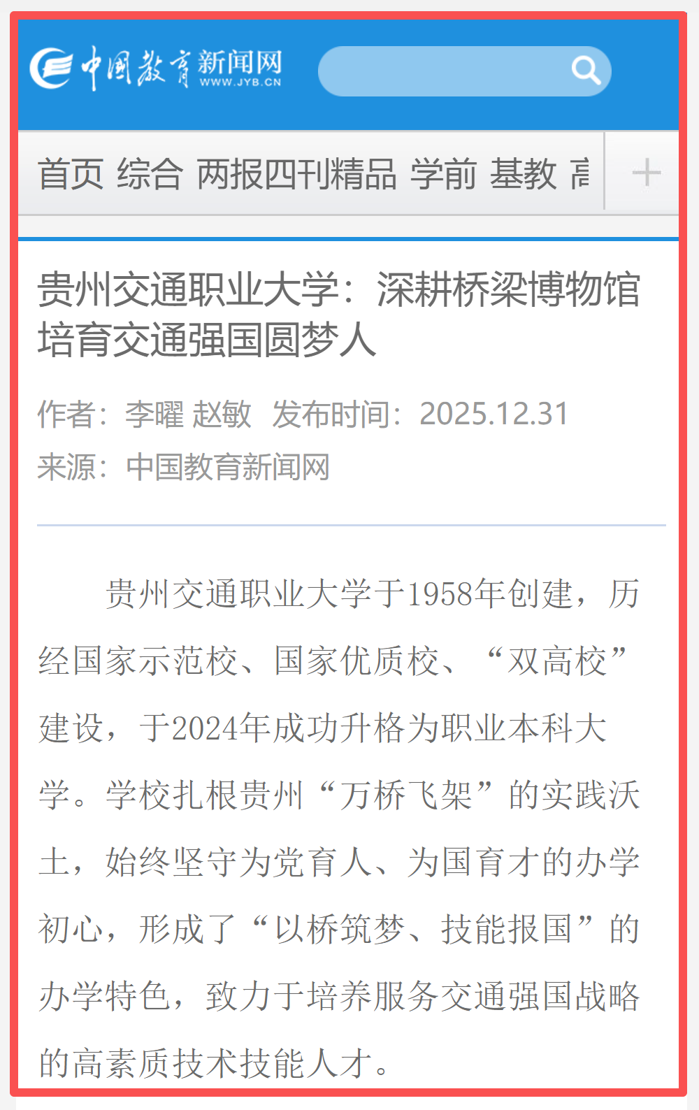 2025年12月31日,中国教育新闻网刊发文章《贵州交通职业大学:深耕桥梁博物馆 培育交通强国圆梦人》报道我校办学成果。全文如下:
