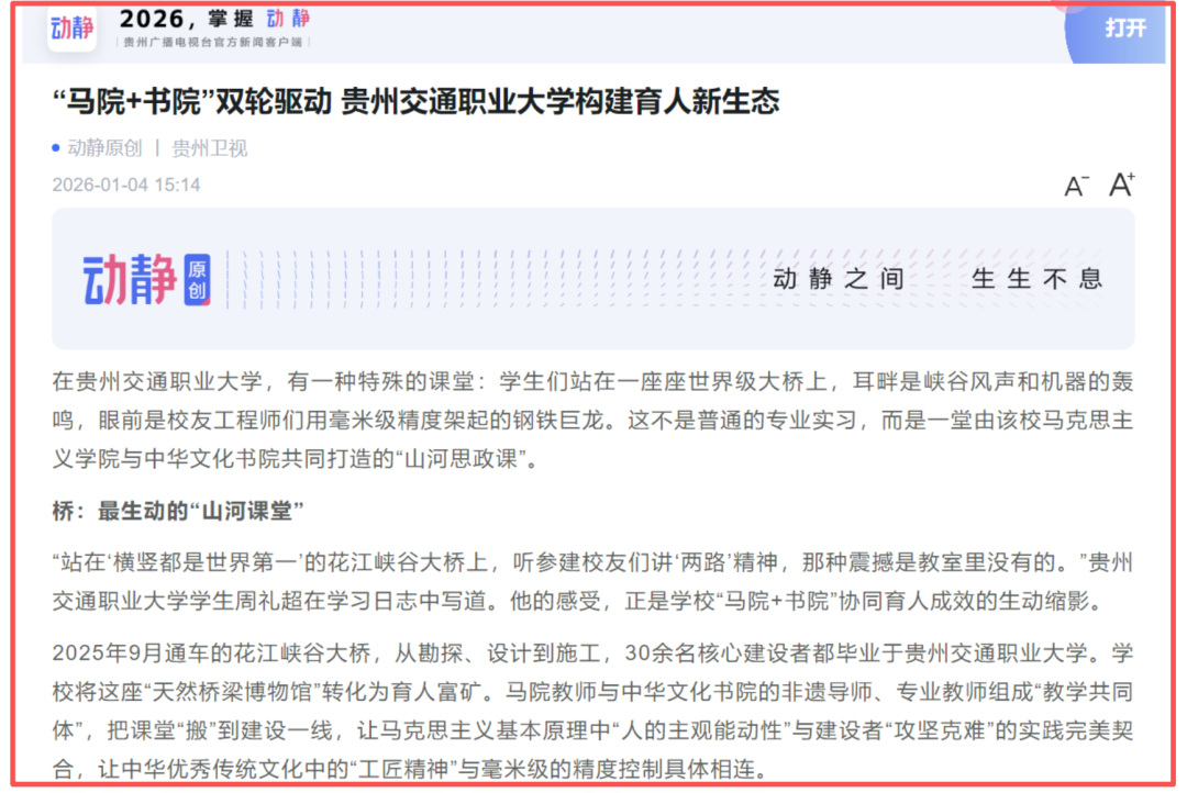 1月4日,动静新闻发布文章《“马院+书院”双轮驱动 贵州交通职业大学构建育人新生态》报道我校协同育人新路径。全文如下: