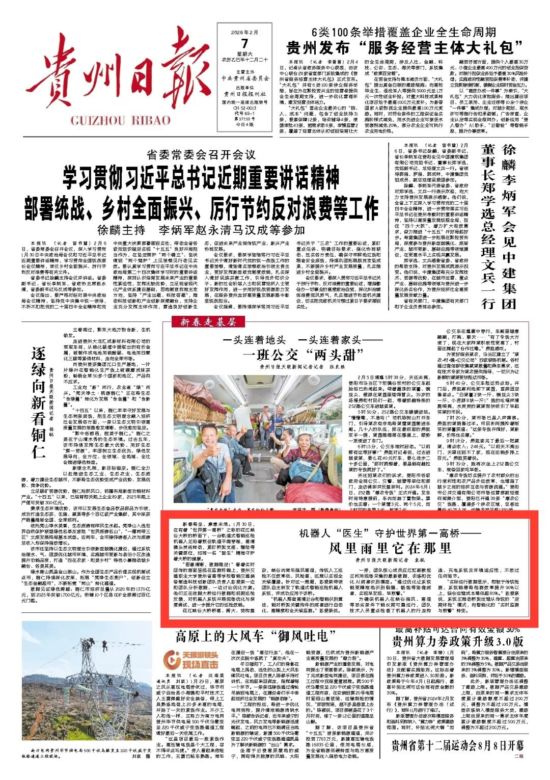 媒体关注 | 贵州日报头版聚焦我校科研成果转化:机器人“医生”守护世界第一高桥