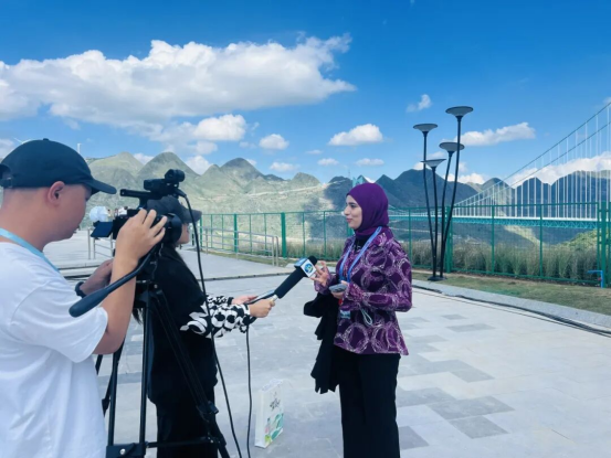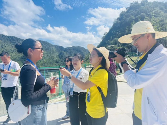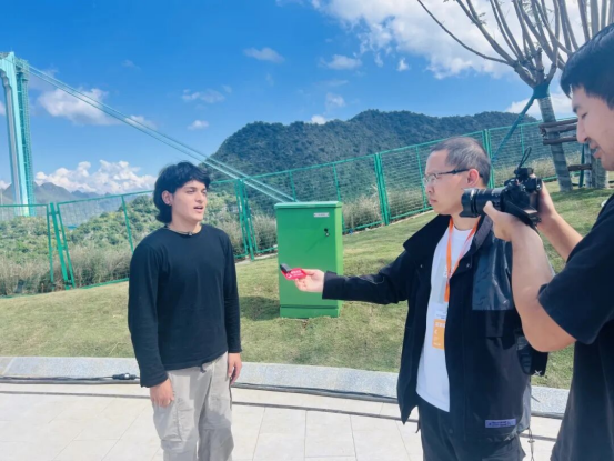 花江峡谷大桥桥面距水面625米,建设者们凭借智慧与技术攻克了复杂地形、强风等多重挑战;云渡服务区则融合文化与旅游功能,成为“交通+旅游”新节点。活动现场,贵州日报社、贵州电视台、“动静新闻”等媒体记录盛况,同时采访了参与研学的国际学生。