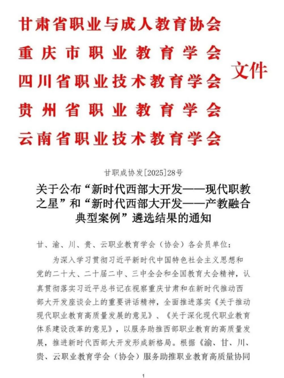 近日,由甘、渝、川、贵、云五省市职业教育学会(协会)开展的“新时代西部大开发——现代职教之星”和“新时代西部大开发——产教融合典型案例”遴选结果公布。我校教师向巍团队撰写的《党建引领专业发展 数智驱动四链融合——山区道路场景下智能网联汽车专业建设探索与实践》入选新时代西部大开发“产教融合典型案例”,龚波、王键2名教师获评“德技双馨之星”称号,杨亮、徐海龙、张庭鹏3名学生获评“技术技能之星”称号。