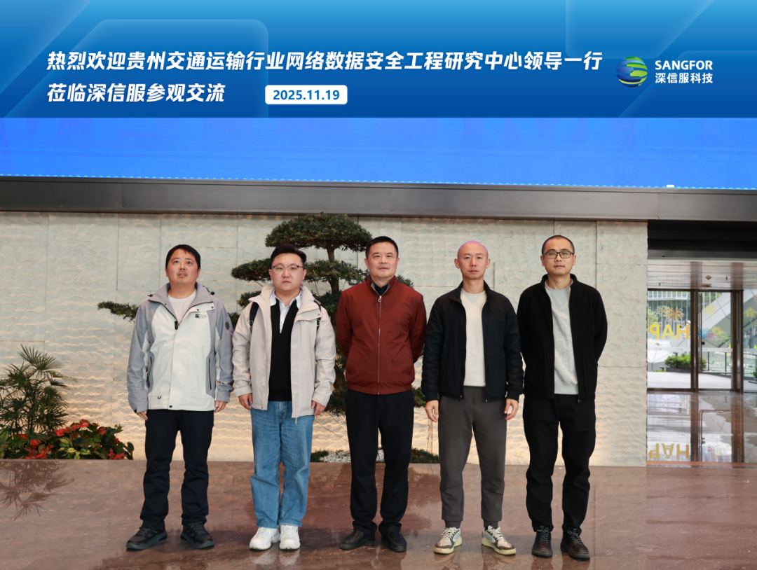 近日,交通运输行业网络数据安全工程研究中心团队赴深信服科技股份有限公司调研交流,并现场获授 “贵州区域交通运输行业安全运营服务资质(高级)”授权书。