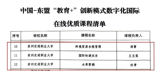 近日,中国-东盟教育交流周组委会秘书处办公室发布《关于中国-东盟“教育+”创新模式数字化国际课程征集活动在线课程名单的公告》,经专家严格评审与遴选,全国共有107门课程被认定为数字化国际课程。我校表现突出,轨道交通学院的《工程测量技能实验培训模块化海外资源包》被认定为在线精品课程,物流工程学院的《跨境贸易合规管理》《国际快递实务》《水果营销》被认定为优质课程。
