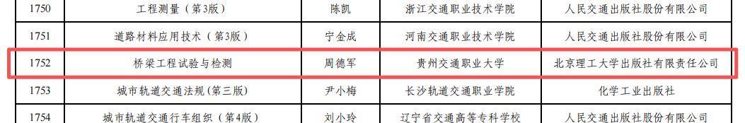 根据教育部发布的《第二批“十四五”职业教育国家规划教材书目》,我校《公路工程检测技术(第7版)》《桥梁工程试验与检测》《汽车维护技术》《人工智能基础与应用(第二版)》4部教材成功入选。