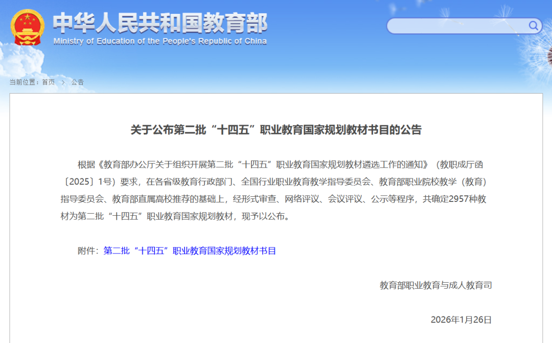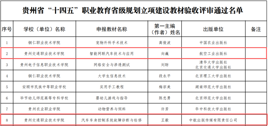 近日,教育部与贵州省教育厅相继公布“十四五”职业教育国家及省级规划教材遴选结果,我校教材建设工作取得重要进展,共4部教材入选“十四五”职业教育国家规划教材,11部教材拟通过省级验收。