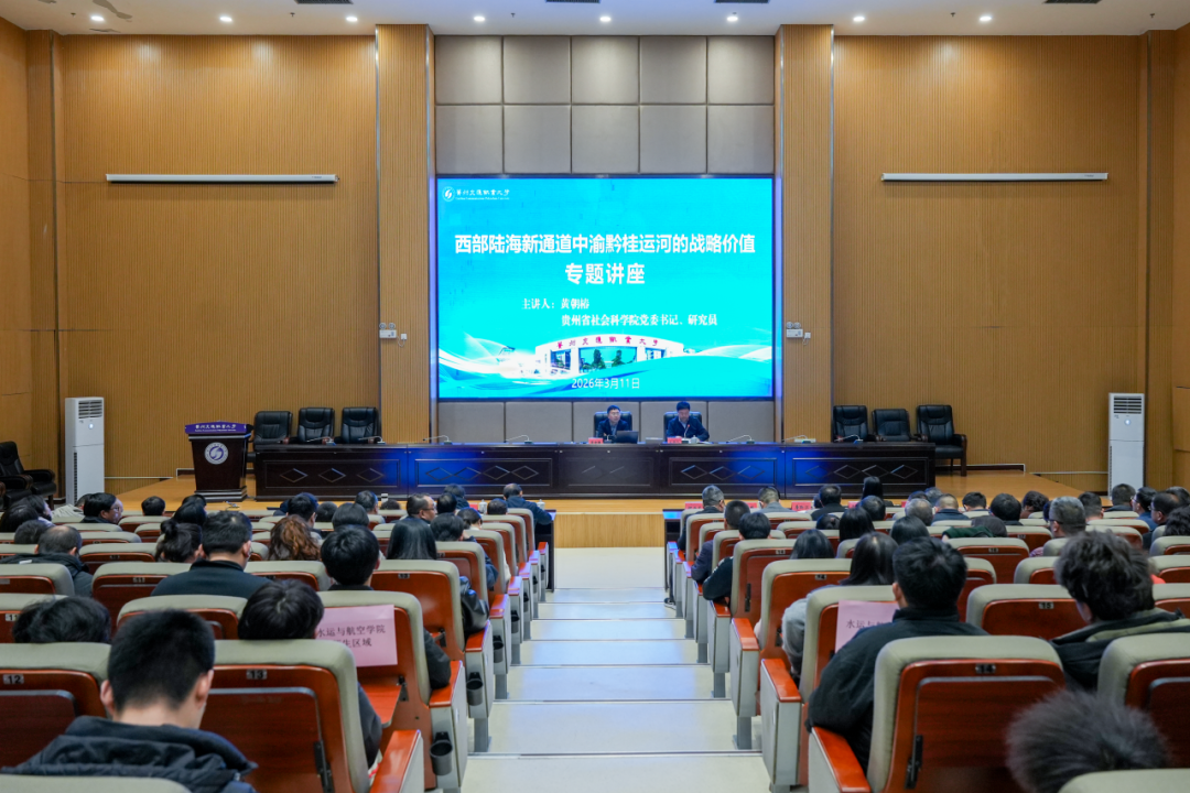 3月11日上午,我校特邀贵州省社会科学院党委书记黄朝椿到校作题为“西部陆海新通道中渝黔桂运河的战略价值”的专题讲座。校党委书记何兴发主持讲座,在家校领导、正科级及以上干部、水运与航空学院全体教师及轮机专业学生共同聆听。